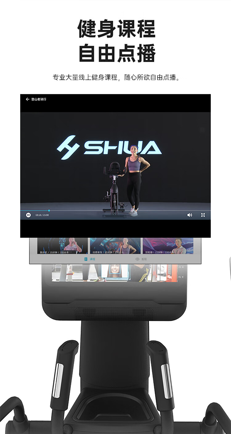 舒华立式商用健身车SH-B9100U(V10)触屏版拥有超大显示和操作屏幕, 可以任意设置阻力、时间和距离等参数,还可以即时显示心跳和转速等数据,同时,SH-B9100U提供多项科学运动处方,更轻松掌握运动节奏。