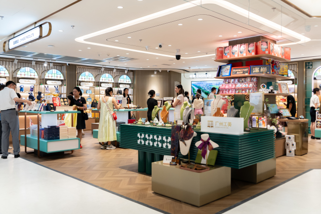 值得关注的是,店内特设“国潮文化馆”,大新公司广州工美以此为展现岭南文化的窗口,携多款国潮臻选入驻,涵盖猛犸牙首饰、广彩茶具、广绣摆件、香云纱丝巾和广府文化文创,兼具文化厚度与美学张力,是承载岭南非遗的“城市伴手礼”。猛犸牙雕时尚套饰以细腻刻工再现传统纹样与现代设计语言的交融;广彩茶具以浓彩重金诠释“万缕金丝织白玉”的华美底蕴;广绣摆件则以丝线为墨,勾勒出岭南风物的独特意趣;而“趣致”的文创产品巧妙融入广府元素与日常生活,尽显广州深厚历史文化在当代的焕新生命力,让消费者感受到“活力广州、国潮匠心”,促进“购在中国”热度更加持久。